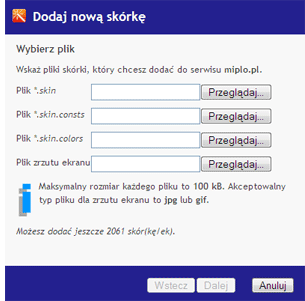 Dodając do Miplo nową skórkę należy przygotować 3 pliki *.skin, *.skin.consts oraz *.skin.colors. Wymagany jest także plik graficzny prezentujący walory skórki.
